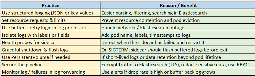 The sidecar should handle bursts: buffer logs, backoff, retry to Elasticsearch